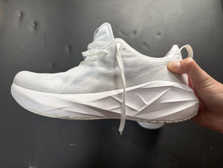 ノヴァブラスト5のフォルムは、前後にボリュームのあるソールが印象的で、真横から見ると独特の厚みが際立ちます。